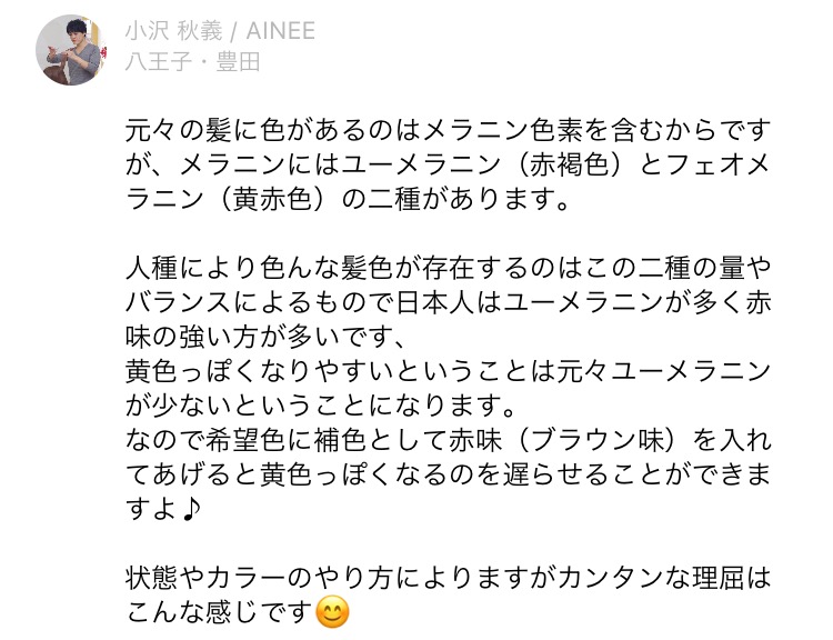 なので希望色に補色として赤味(ブラウン味)を入れてあげると黄色っぽくなるのを遅らせることができますよ♪