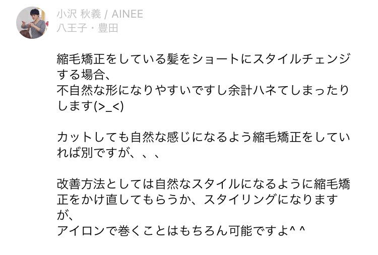 【質問】【回答】 髪のいろいろブログ 縮毛矯正したあとのデザインの自由度。 2017年5月28日 小沢 脩 Facebook Twitter はてブ Feedly 八王子の髪質改善美容室アイニーのHPはコチラ←クリック 【質問】 【回答】 ※ご予約、ご相談はLINE@、ホームページ、お電話にて承ります。 アイニーのご予約は下記のリンクから! 〠193-0832 東京都八王子市散田町3-18-11-248ショッピング街202 Tel:042-663-5833 営業時間:10時00分〜20時00分 E-mail:ainee248@gmail.com ご予約はこちら Facebook Twitter はてブ Feedly