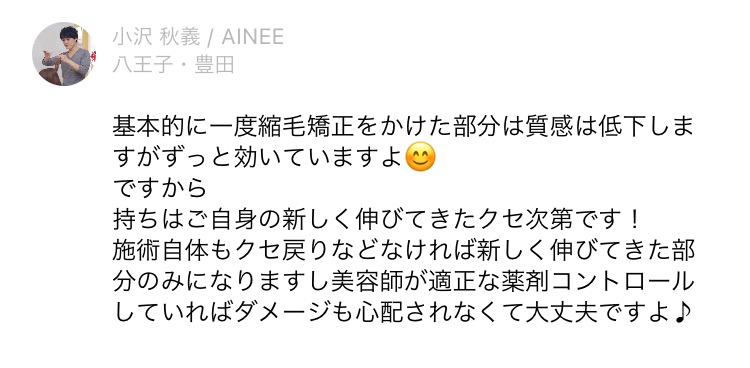 施術自体もクセ戻りなどなければ新しく伸びてきた部分のみになりますし美容師が適正な薬剤コントロールしていればダメージも心配されなくて大丈夫ですよ♪